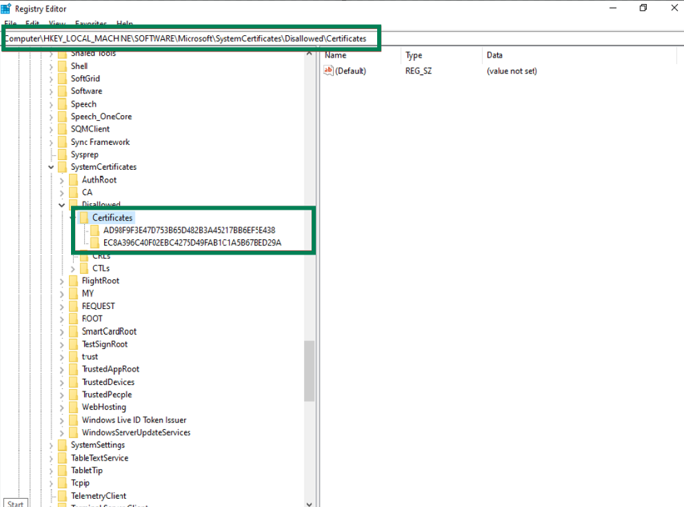 The registry import will add entries under HKEY_LOCAL_MACHINE\SOFTWARE\Microsoft\SystemCertificates\Disallowed\Certificates\… This aligns with Sectigo’s R46 & E46 roots thumbprints and flags them as disallowed.