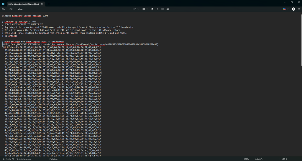 - Download “IISFix-MoveSectigoSelfSignedRoots-Disallowed.reg”